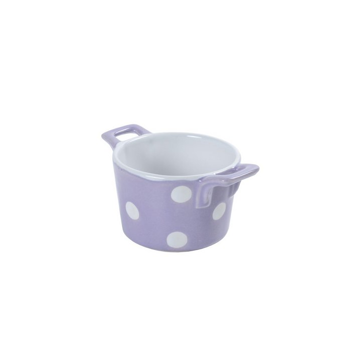 Fliederfarbenes Auflaufförmchen mit Griffen und Punkten, ideal für Soufflés, Muffins oder Pudding. Kann in der Spülmaschine, im Backofen und in der Mikrowelle verwendet werden.