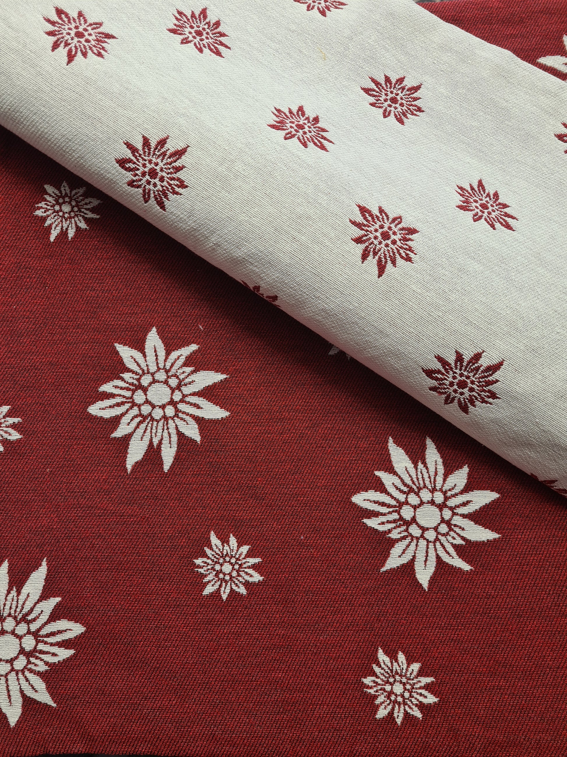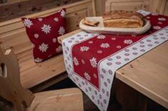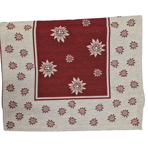 Adorable chemin de table à fond rouge et blanc (crème) et décor edelweiss.