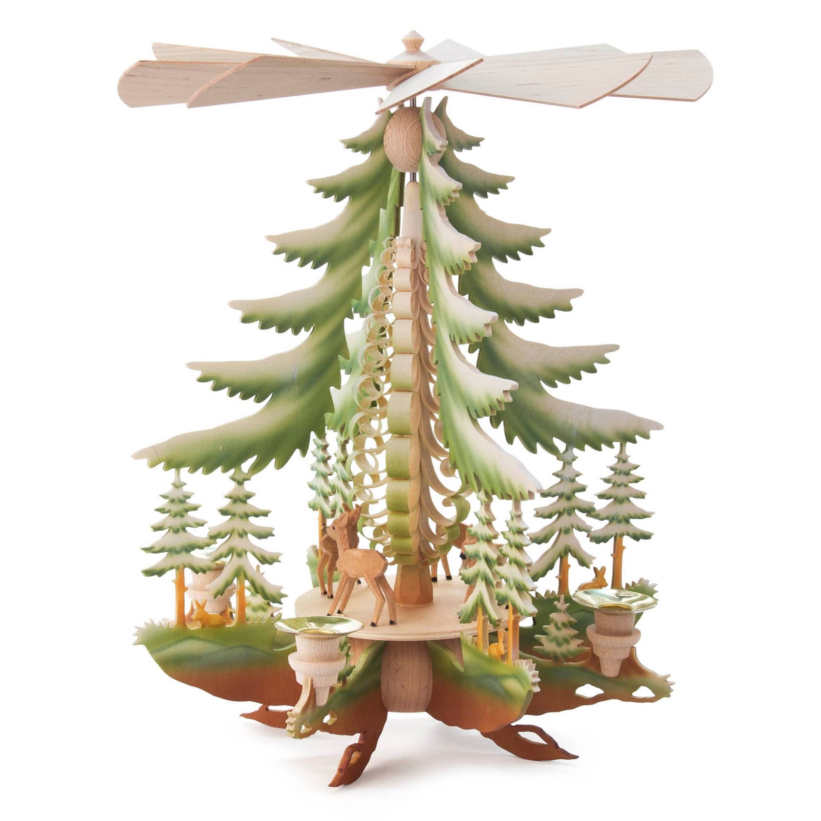 Diese Weihnachtspyramide ist ein echtes Highlight für alle Liebhaber von Waldszenen und Naturmotiven. Die Umrisse der Pyramide sind als Baum gestaltet und verleihen diesem Produkt eine besondere Note. Die vielen liebevollen Details machen diese Pyramide zu einem echten Hingucker. Die schlichten Farben in Kombination mit den Rehen erinnern an eine idyllische Waldszene. In der Mitte der Pyramide befindet sich ein leicht farbiger Spanbaum, der das Gesamtbild perfekt abrundet. Dieses Produkt ist für Kerzen mit einem Durchmesser von 14mm geeignet und wird Ihnen garantiert eine gemütliche Atmosphäre bescheren.