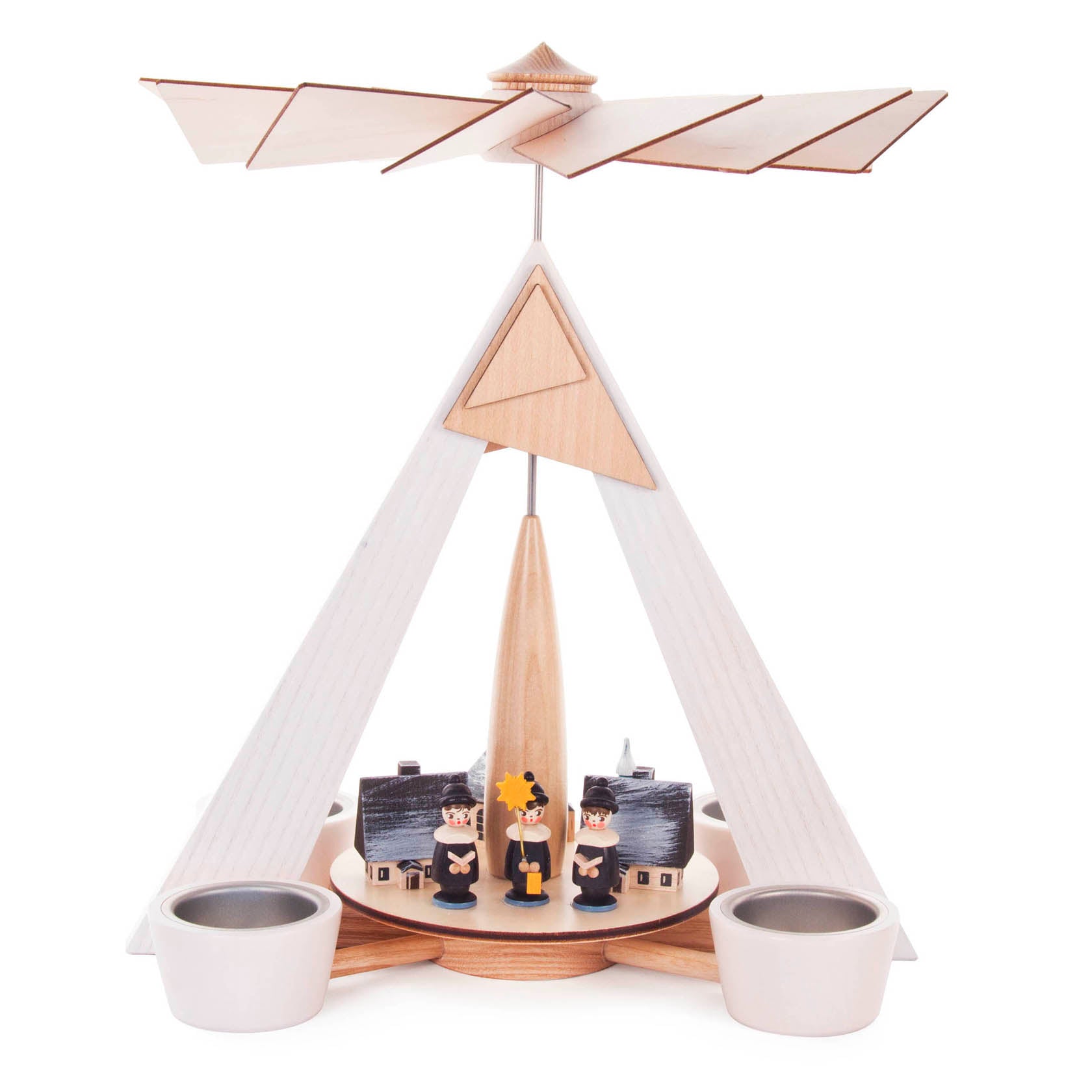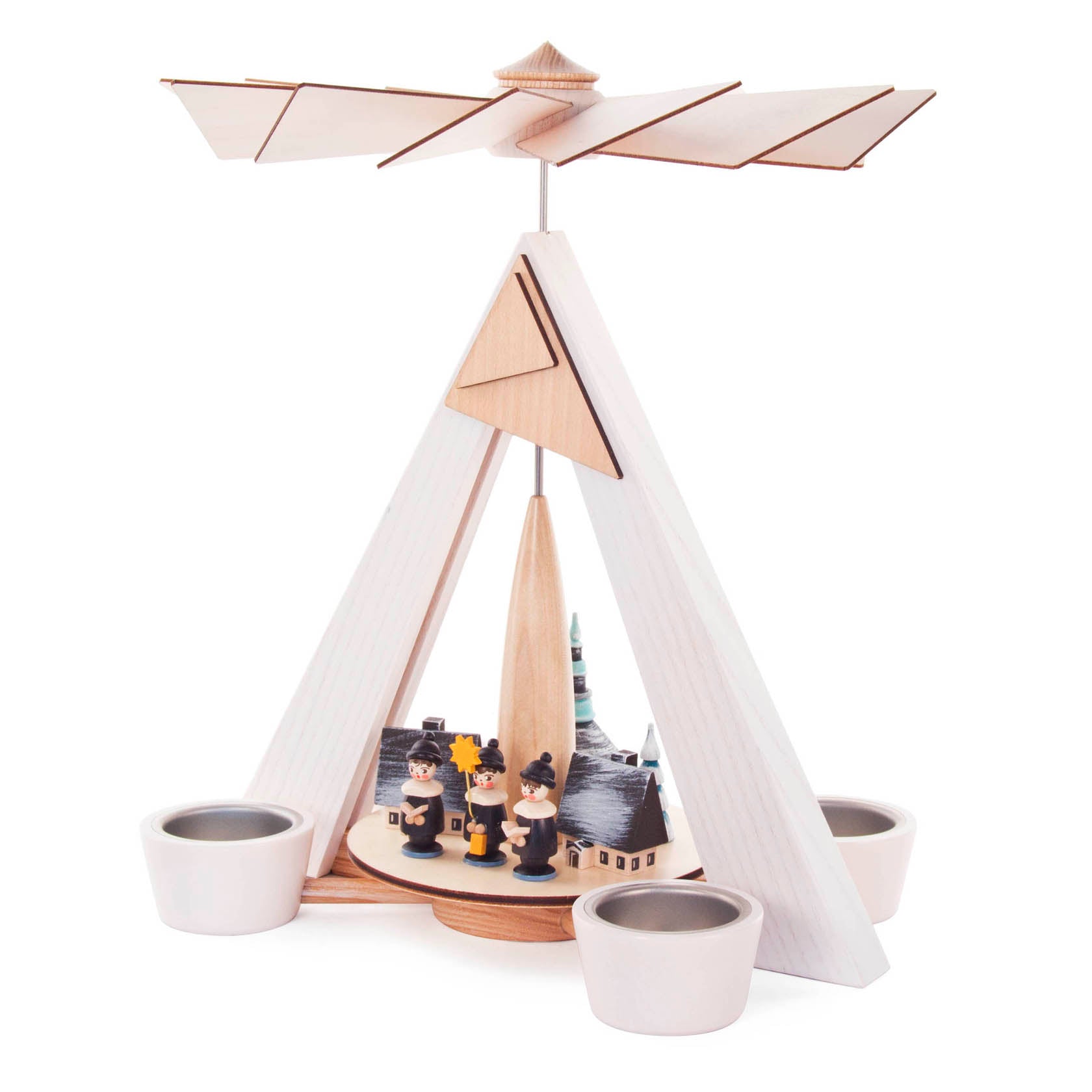 Mit ihrem Seiffener Dorf und der Kurrende verzaubert diese Weihnachtspyramide jeden Raum und schafft eine gemütliche Atmosphäre. Die Pyramide ist ein echter Hingucker und ein Must-Have für alle Liebhaber traditioneller Handwerkskunst. Der Rahmen und die Teelichthalter sind weiß lackiert, während die Laufscheibe und das Flügelrad in ihrer natürlichen Holzfarbe gehalten sind. Die farbigen Figuren, wie die Kurrendesänger, die Seiffener Kirche und die Häuser, verleihen der Pyramide einen besonderen Charme. Die Pyramide wird durch vier Teelichte angetrieben und sorgt somit für eine angenehme Beleuchtung. Die Kurrende dreht sich fröhlich im Kreis und verbreitet gute Laune. Die Pyramide ist nicht nur ein tolles Dekorationsobjekt, sondern auch ein tolles Geschenk für Freunde und Familie.