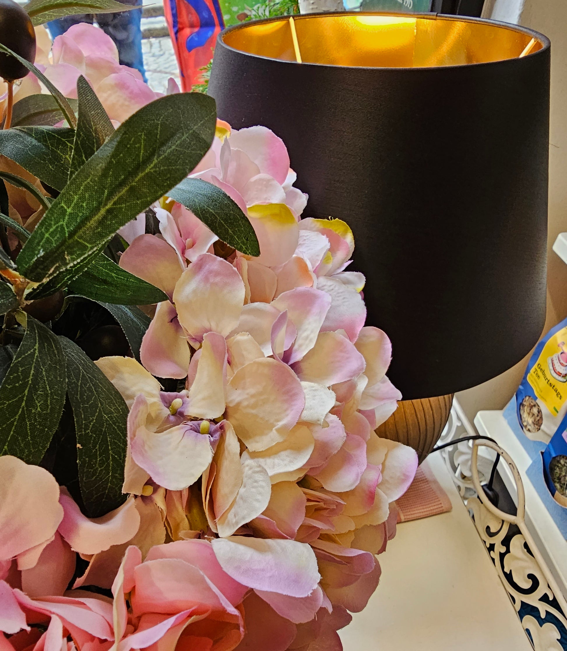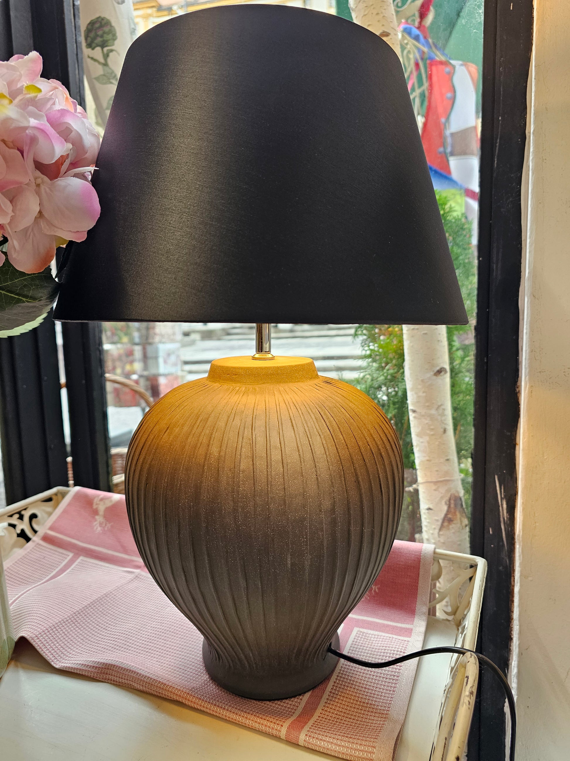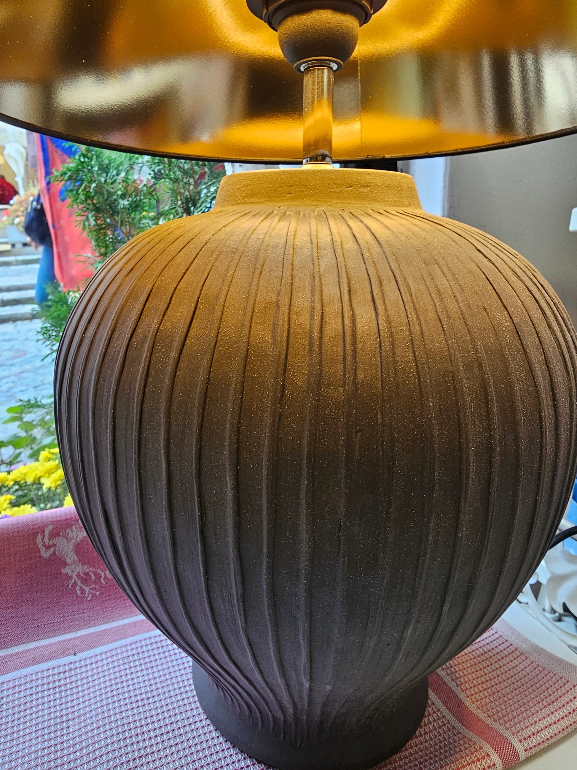 Handgefertigte, sorgfältig geschnitzte Lampe aus schwarzem Grog-Ton. Mit schwarz-goldenem Farbton. Eine perfekt künstlerische Lampe, die allen Räumen Harmonie verleiht. Der Schirmaufsatz besteht aus Metall und nicht aus Kunststoff. Eine kleine britische Firma hat ROHS-konformes, hochwertiges Metall hergestellt. Die Innenseite des schwarzen Lampenschirms ist mit goldenem Stoff überzogen, sodass das reflektierende Licht die Eleganz der Lampe und ihrer Umgebung unterstreicht.