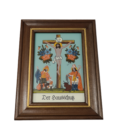 Hausschutz mit türkisem Hintergrund und Schriftzug. Das Bild wurde per Hand verkehrt auf der Rückseite des Glases gemalt - echte Hinterglas Malerei aus alter Tradition.