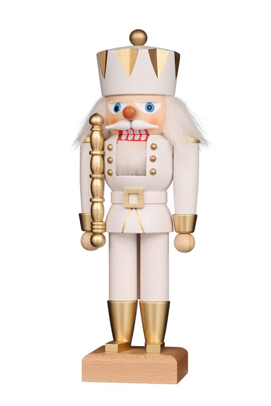 Ganz besonders herausgeputzt hat sich der Nussknacker König. Die weiß-goldene Uniform trägt er aus besonderem Anlass. Die prächtige Krone und das Zepter verleihen ihm Würde.