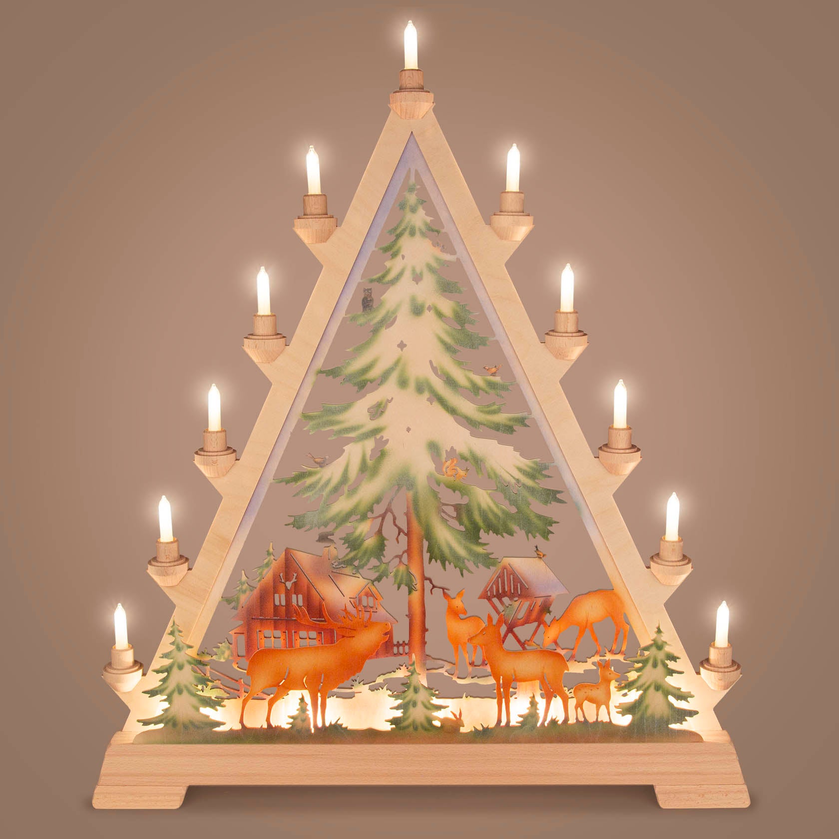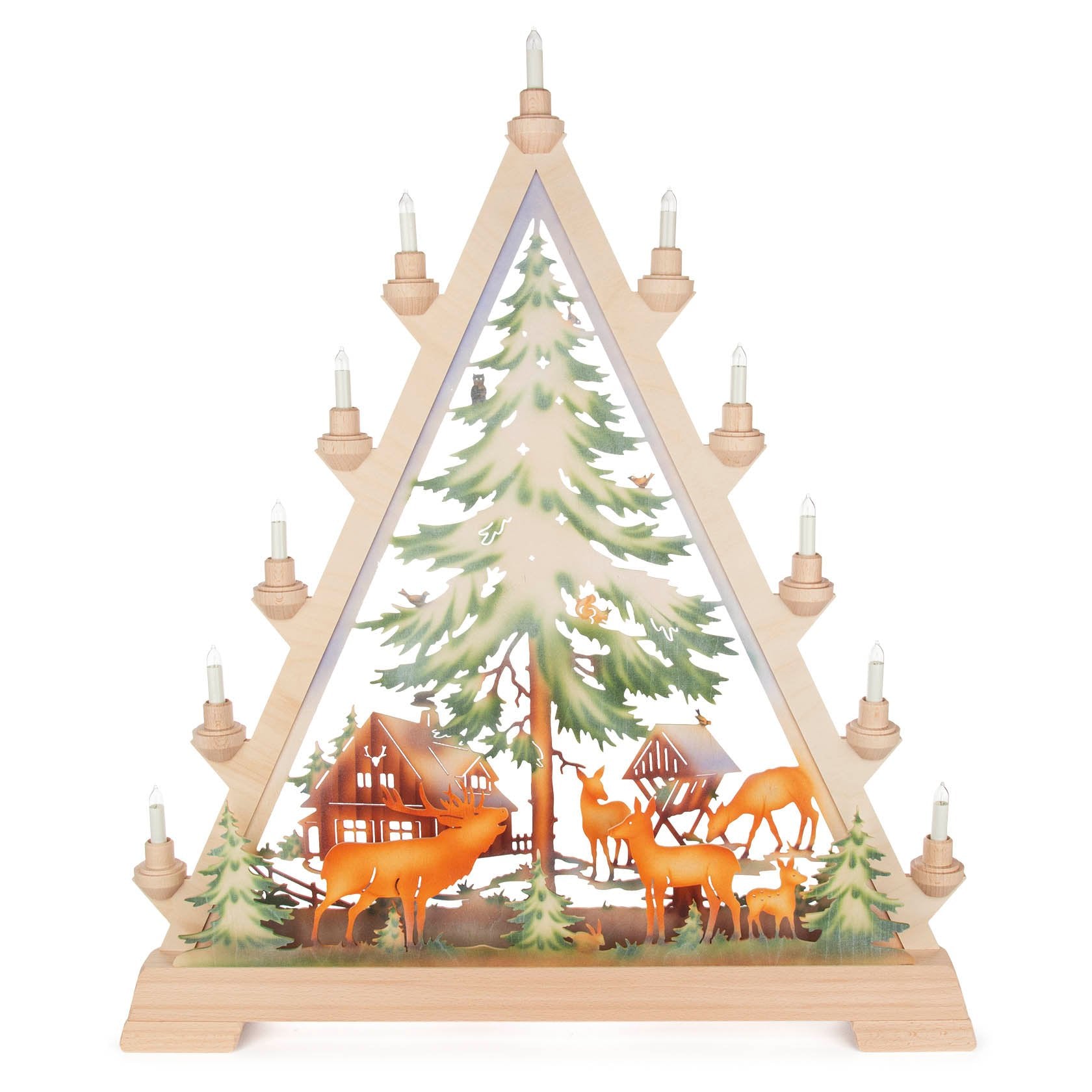 Der Schwibbogen-Spitze Forsthaus in farbiger Gestaltung bringt eine besondere Atmosphäre in Ihr Zuhause. Mit seiner Vorbeleuchtung setzt er stimmungsvolle Akzente und ist ein echter Hingucker. Die liebevoll gestalteten Rehe verleihen dem Schwibbogen eine natürliche und harmonische Note, die perfekt in jede winterliche Dekoration passt.